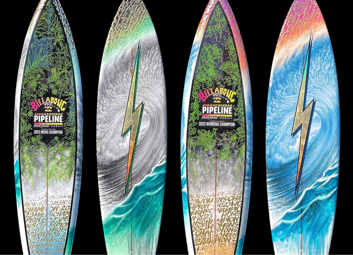 In addition to the Pipe Masters trophy, the winner is also presented with a one-of-a-kind surfboard. The trophy surfboard is a 7’2″ Pipeliner Gun shaped by Gerry Lopez — a recreation of the classic board Gerry rode at Pipeline in the 1970s. And then artist, Phil Roberts paints, illustrates, and customises the surfboard to make it a true collectable and extremely valuable work of art. Each year also features guest partners, from the surf photograph Phil’s art is inspired by to the glassing of the surfboard.